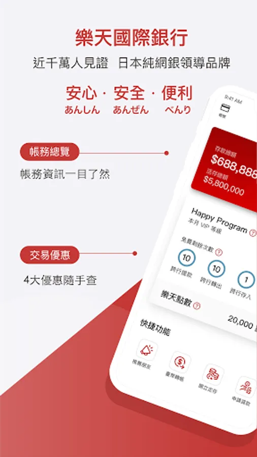 "Safety, Security, and Convenience", Rakuten Bank, which has 10 million users in Japan, has been selected as the best digital bank by "Global Finance" and "The Asian Banker" many times, and has exported 20 years of pure online banking experience across the sea for the first time. Introduce a brand new financial experience for Taiwan from 2021!