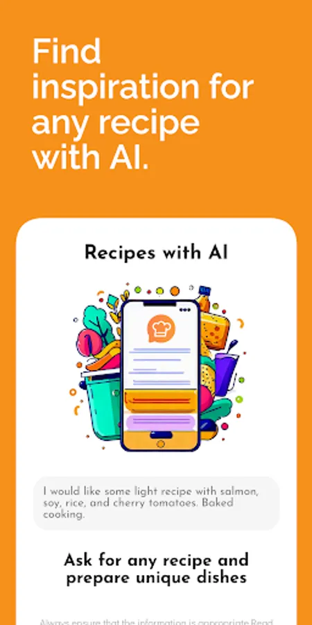Please note that this app uses Chat GPT, a new technology that may provide inaccurate or incomplete information. Recipes with AI is an application that provides culinary ideas and should never be used to replace the advice of an expert in the field of nutrition and diet. Additionally, it is important to always check the ingredients of the proposed recipes based on one's allergies, intolerances or dietary preferences, and to always refer to the nutritional information on food packaging and official websites of reference organizations.