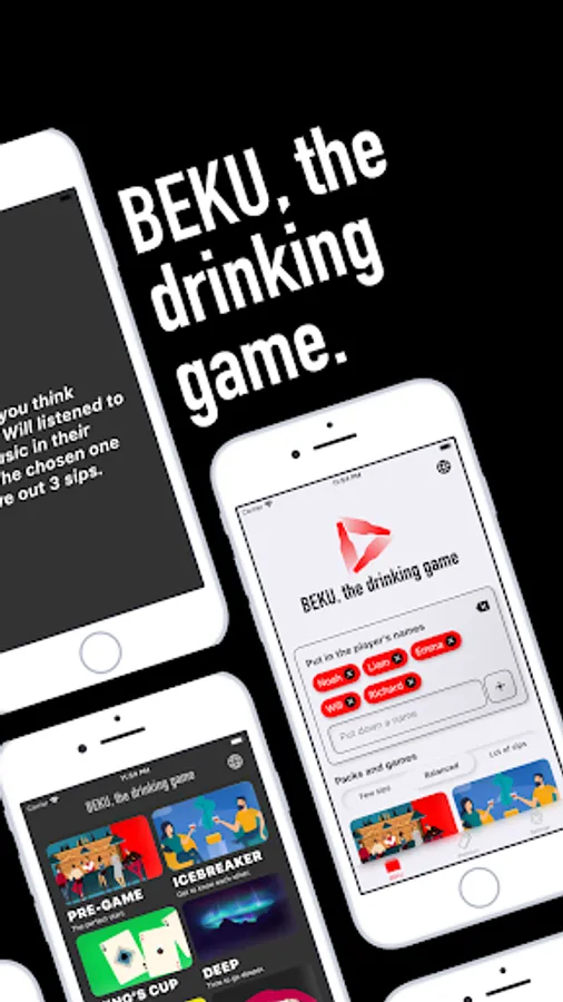 A BEKU is a social party game with 7 game modes and thousands of challenges, like pre-gaming, icebreaker, deep, naughty, crazy and the traditional King's Cup.