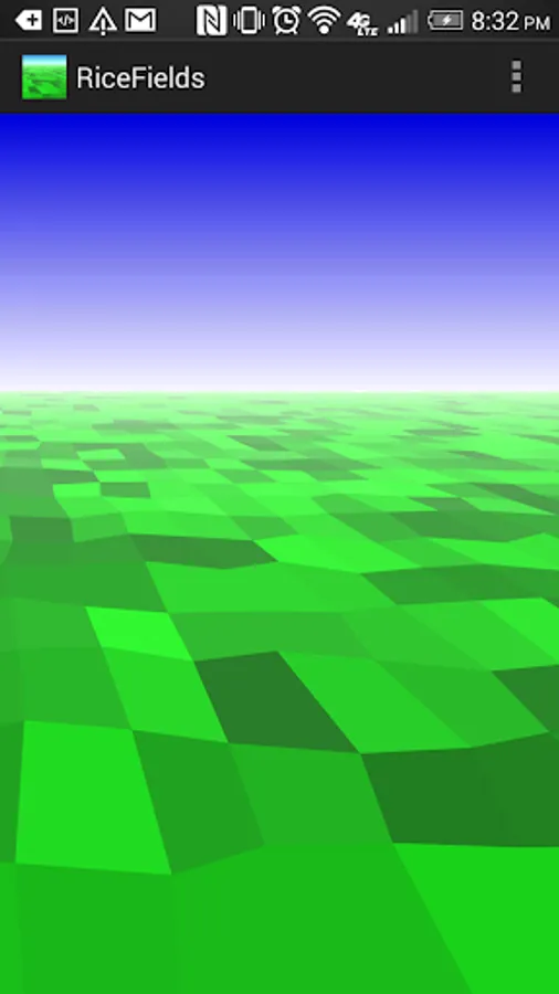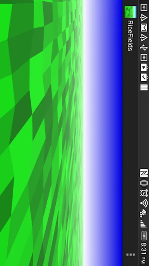 A computer-generated scene depicting an aerial flight-like view of vast rice fields.