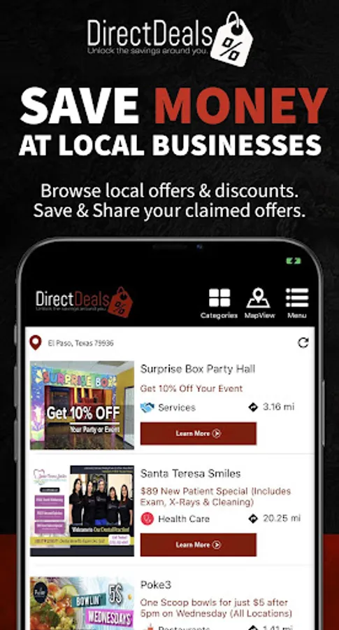 Direct Deals is a free local savings app. Once you're logged in, you'll be able to see discounts and savings from the businesses around you. Get real-time coupons and discounts sent straight to your phone.