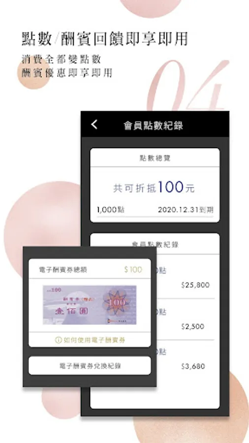 (1) 行動會員卡:消費即可積點,消費滿50元即累積1點,1,000點可折抵100元,點數折抵無上限。