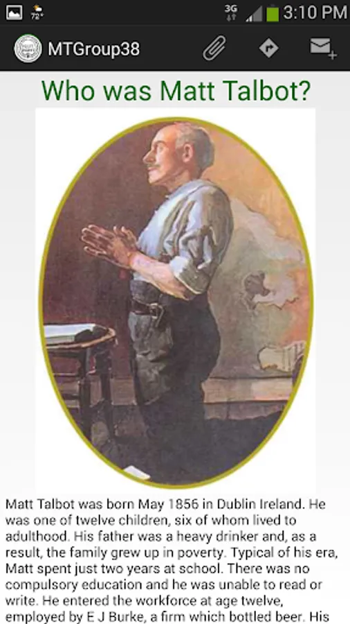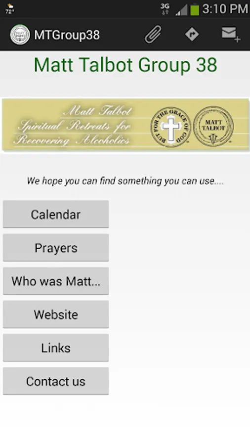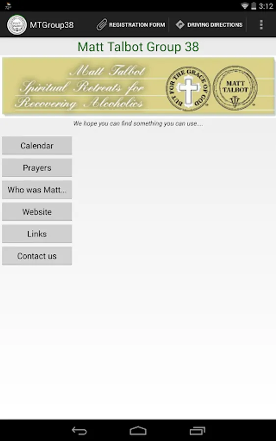 This app provides information resources for Matt Talbot Group 38 members, group affiliates, and anyone else who might be interested in Matt Talbot retreats. Resources include easy access to the Group 38 website, retreat calendar, retreat registration forms, driving directions to the retreat house, and other relevant links. Group members should find this app very useful. Anyone else who might be interested in learning more about Group 38 and its retreats are welcome to use it and reach out to Group 38.