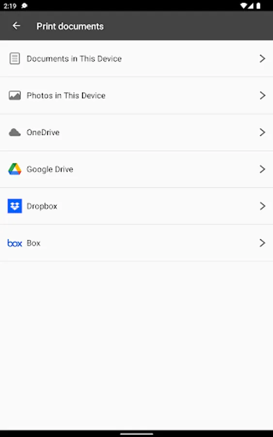 - Available to print documents and photos stored locally in your device or in OneDrive, Dropbox, Google Drive or Box.
