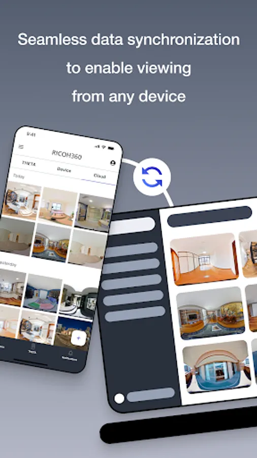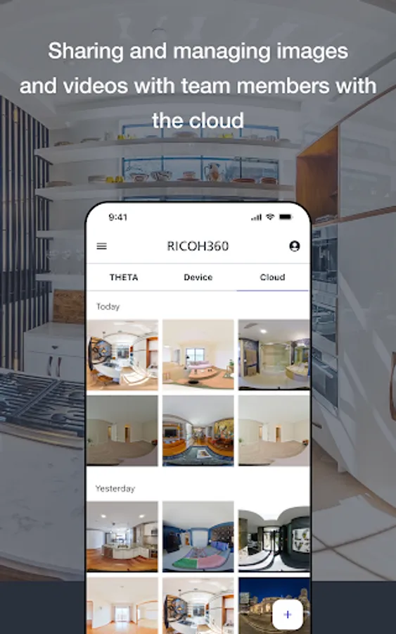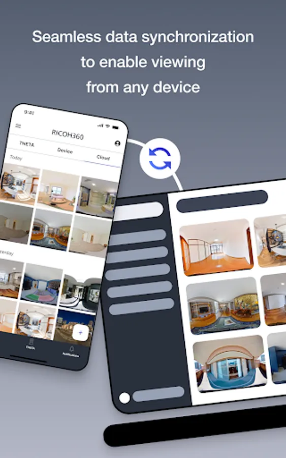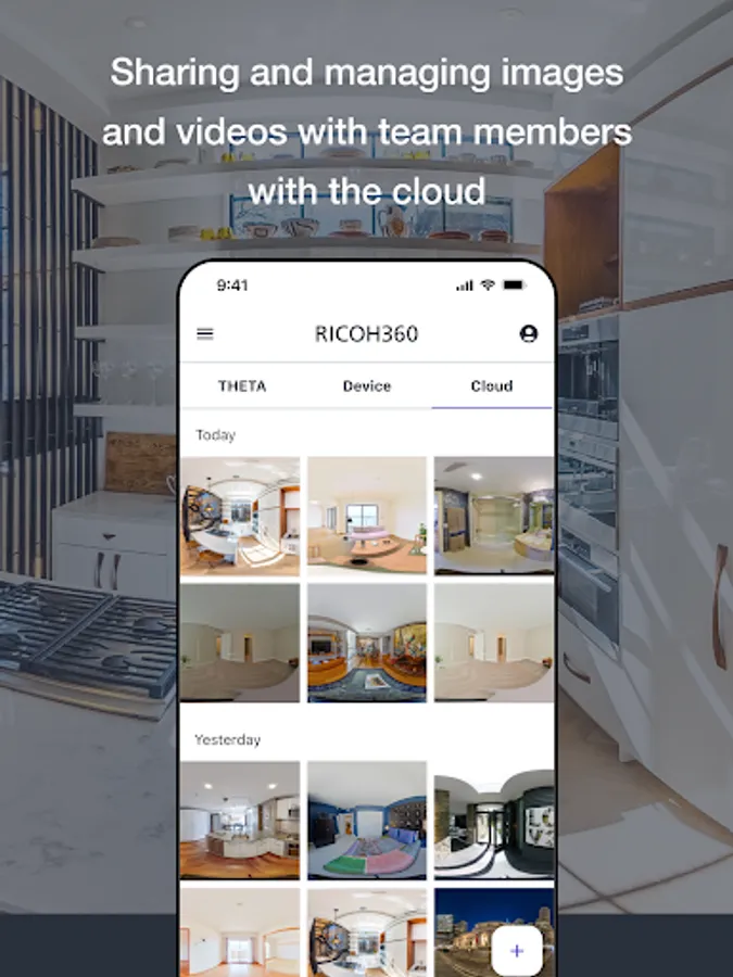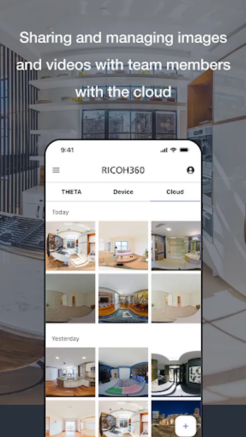 When connecting the 360-degree camera RICOH THETA to the RICOH360 mobile app and shooting images, you can view a preview while shooting the image and automatically synchronize the captured image in the cloud. This enables you to browse images at any time from any device.
