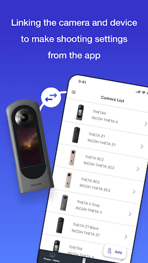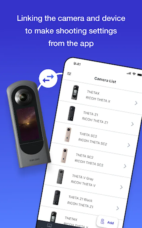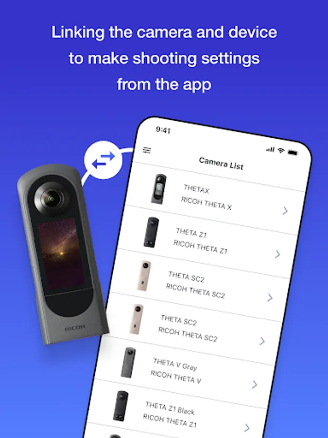 * The RICOH360 mobile app is compatible with RICOH THETA V, RICOH THETA Z1, RICOH THETA SC2, and RICOH THETA X.