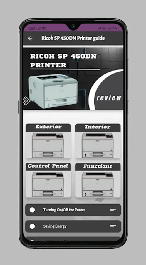 In the Printer Guide app Ricoh SP 450DN Printer we have supported several sections of content that will now allow you more information about Ricoh SP 450DN Printer