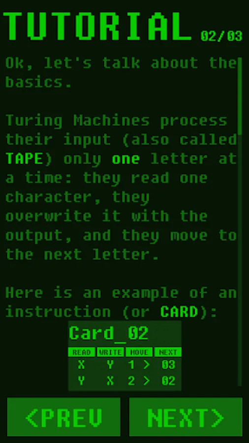 Every level of this game will give you a problem of increasing difficulty. Put your logical thinking skills to the test by programming a Turing Machine to solve the level's problem and unlock the next challenge!