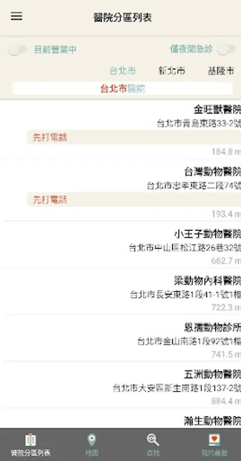 1. All animal hospital information: Detect the user's current location and sort the list by distance. And by the county, city, whether to provide night emergency, whether currently open business filters, to provide users to quickly find hospitals.