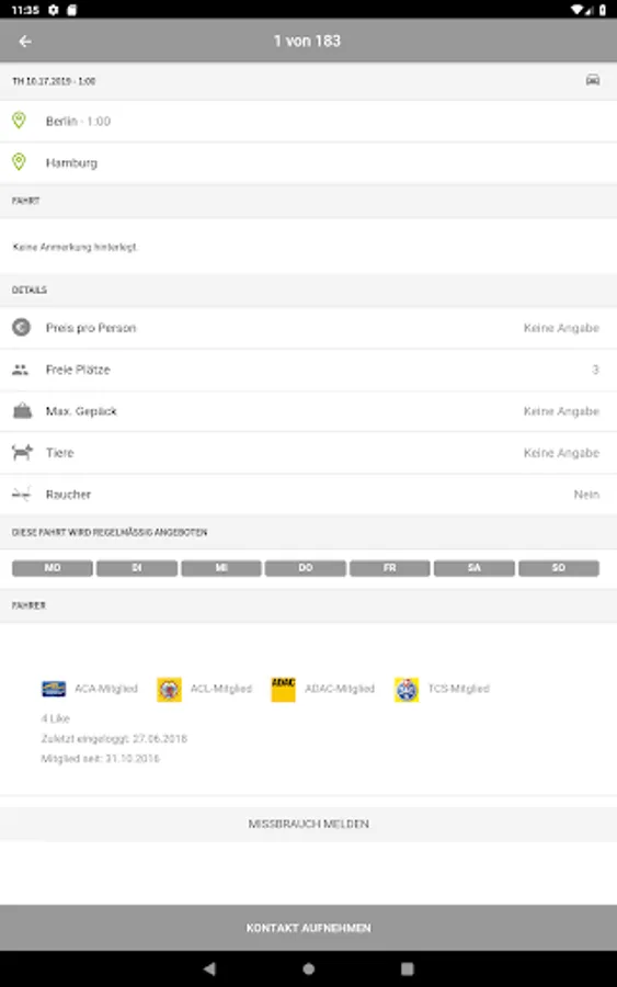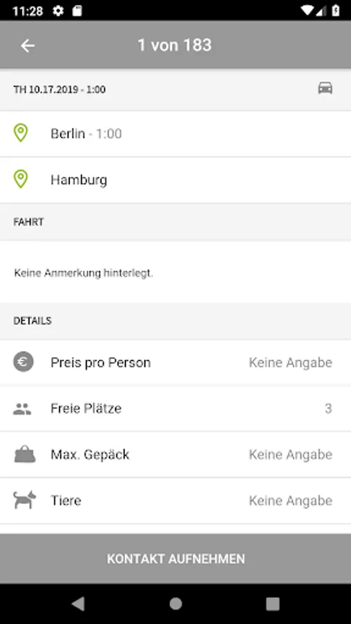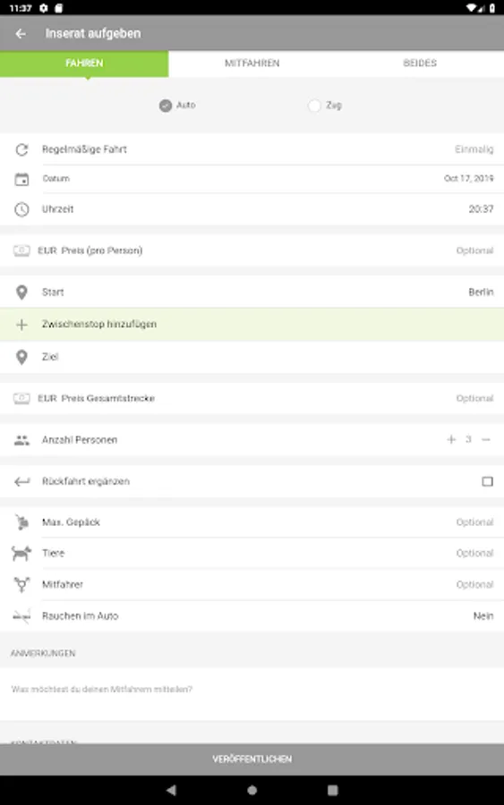 - Optional information/ filter functions for luggage size, gender of the passengers, transport of animals, smoker/non-smoker journey