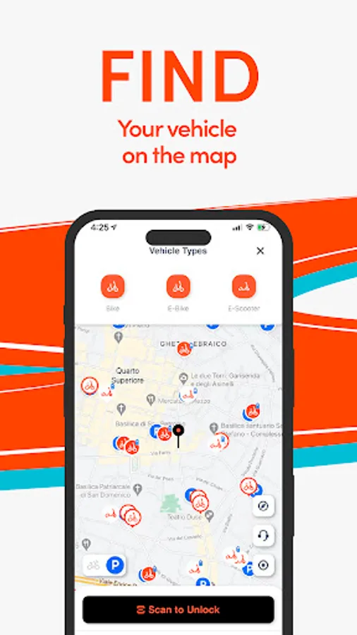 1. FIND the closest bike, e-bike or e-scooter available on your map