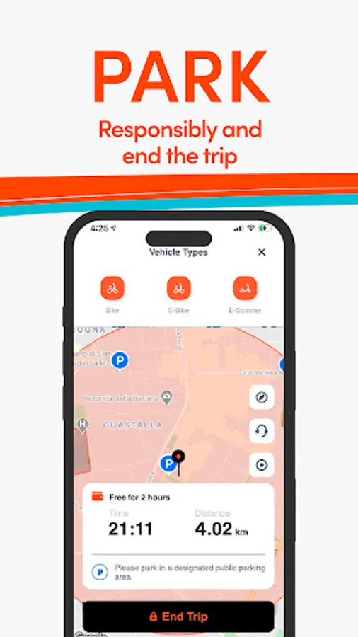 3. PARK responsibly inside the operational area and LOCK your vehicle by ending the ride on your app.