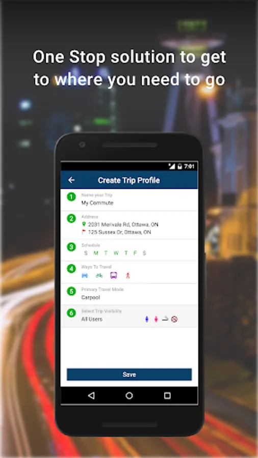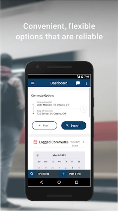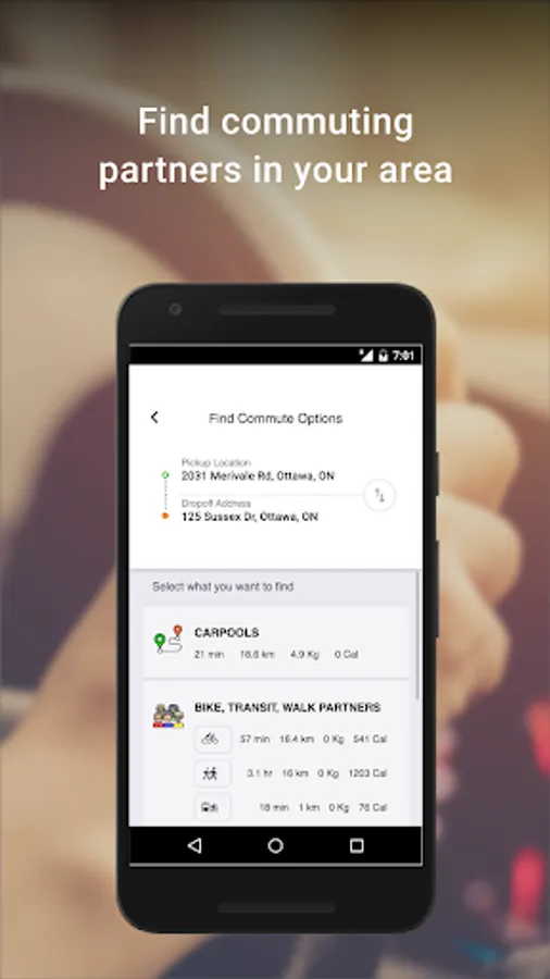EcoCommute is an app for commuters employed at Global Affairs Canada to find sustainable commuting options, such as carpooling, taking transit, cycling, walking, and much more, in the National Capital Region.