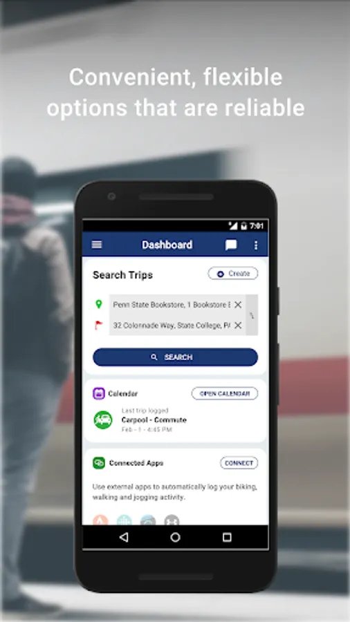 RideOn is a free ride-matching and trip-planning platform available exclusively to Penn State faculty, staff, and students to help get to, from, and around campus.