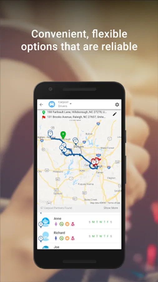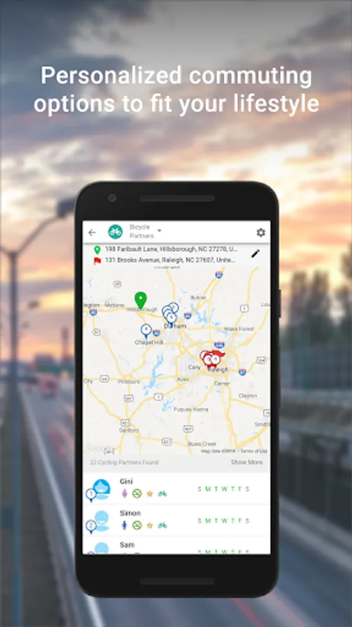 This app will help you quickly and securely find commute partners anywhere in North Carolina! Using your home and work or school addresses, you will be matched to nearby commuters with similar schedules. Your home address will never appear on match lists.