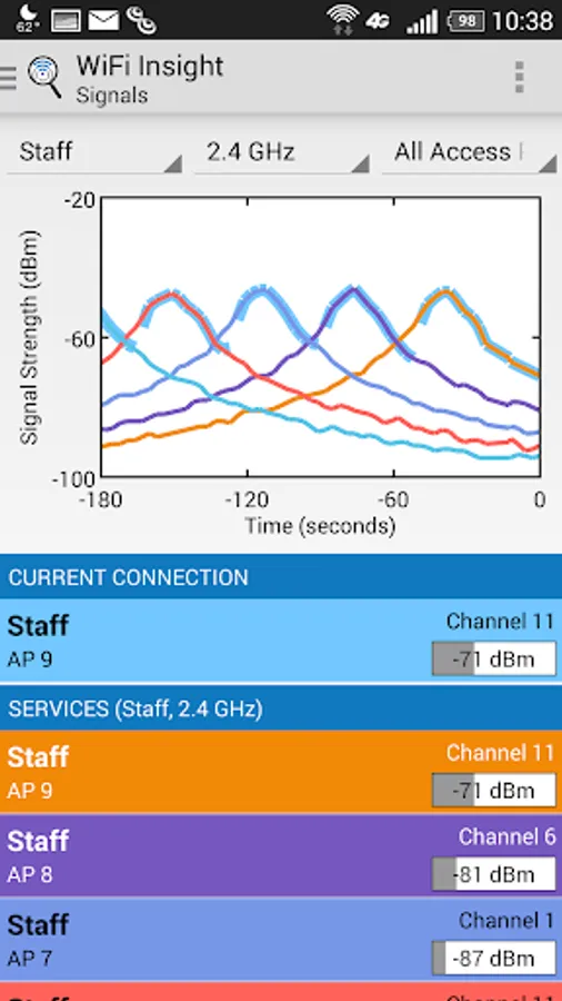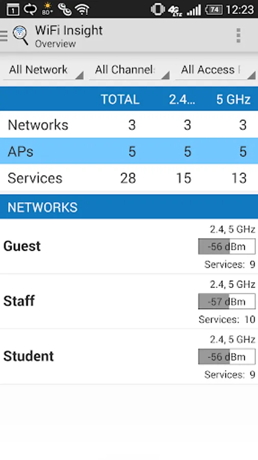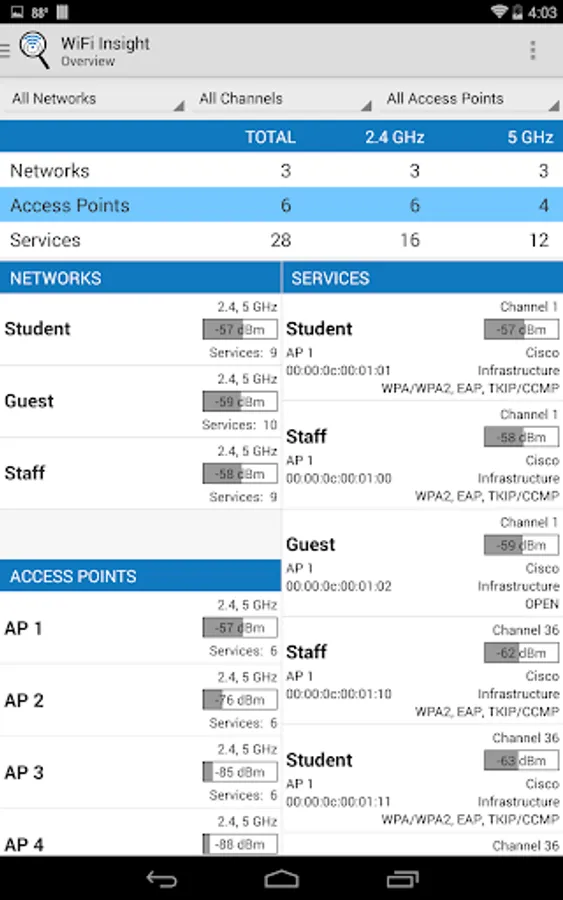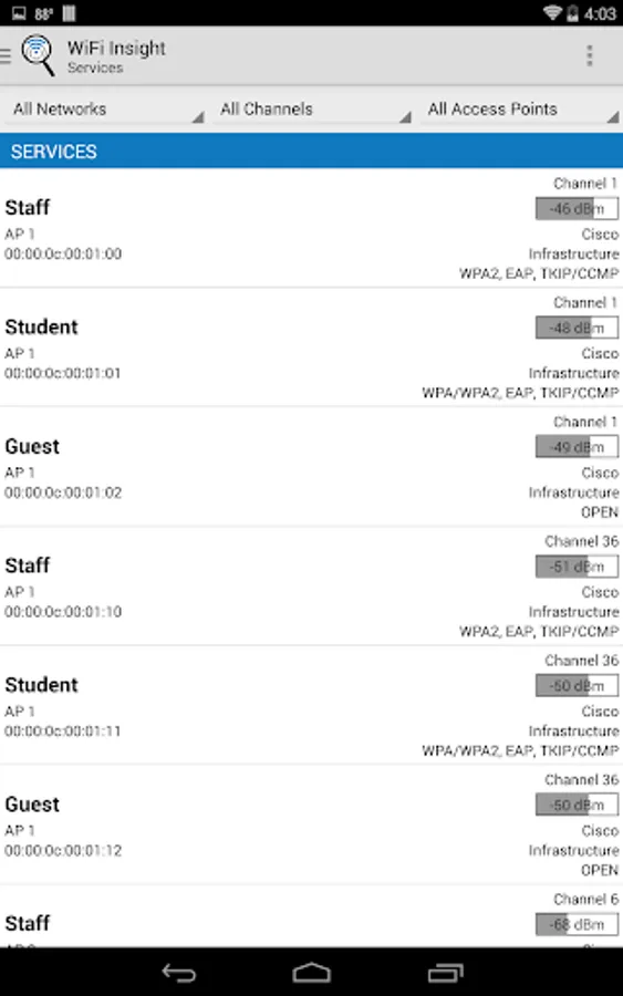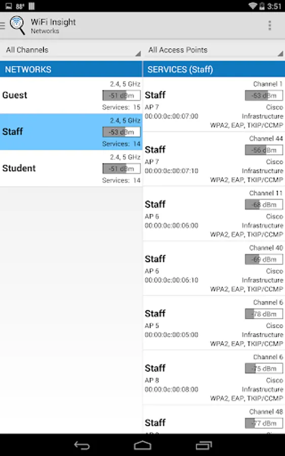 WiFi Insight is designed to be an easy to use WiFi analyzer for IT staff, professional network installers and tech savvy consumers to quickly analyze and understand WiFi networks operating around them. WiFi Insight is an ideal WiFi analyzer for understanding enterprise WLAN deployments where each access point advertises multiple services via multiple 802.11 radios.