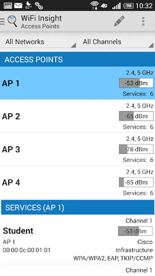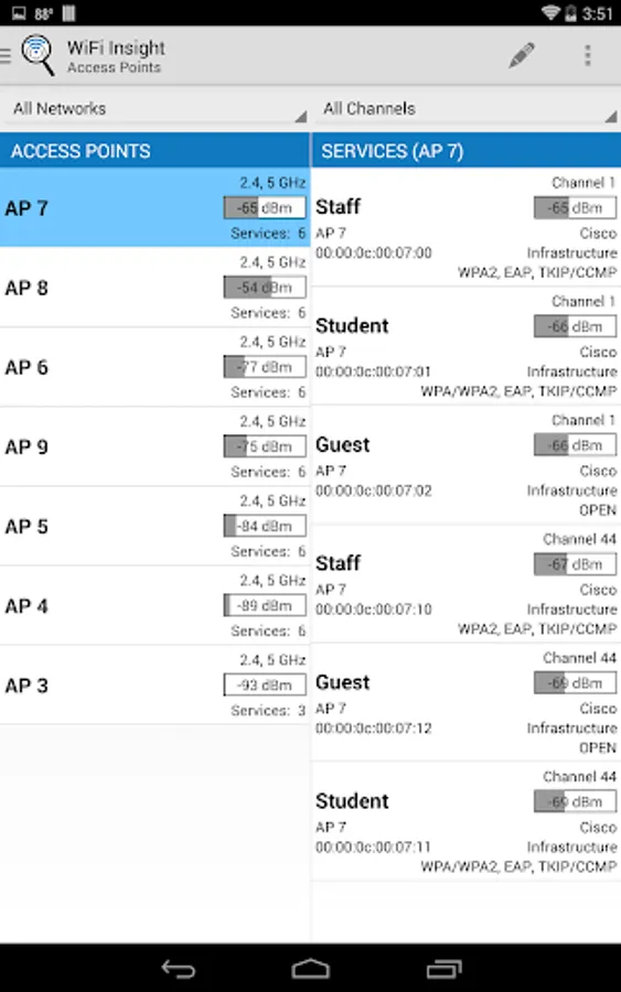 • See SSID, BSSID, signal strength, channel, security settings and access point vendor information