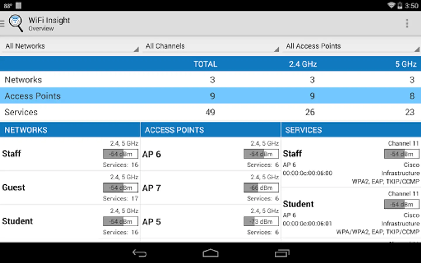 WiFi Insight WiFi analyzer supports 802.11 a/b/g/n/ac based on the capabilities of your Android device.