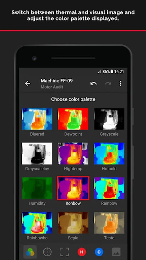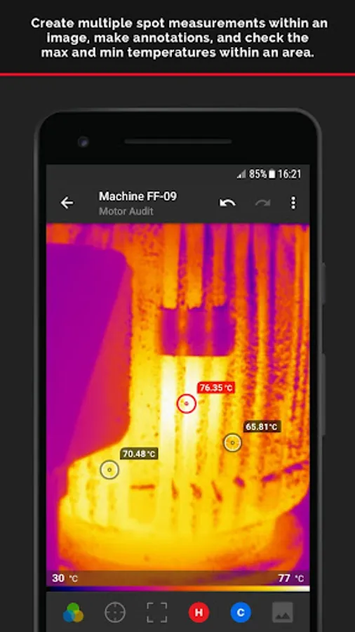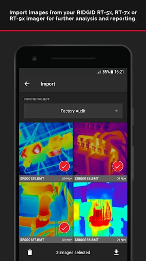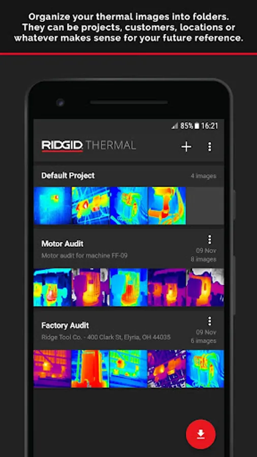 RIDGID Thermal works exclusively with RT-5x, RT-7x and RT-9x Wi-Fi enabled thermal imagers from RIDGID. The app allows seamless transfer of thermal images from the imager to your smartphone or tablet for analysis, organization and sharing. Create multiple spot measurements within an image, easily make annotations, and show the max and min temperatures within an area. It’s easy to navigate between the visual image and the thermal image and well adjust the thermal color palette displayed. Save images and analysis to your photo library and quickly share with others.