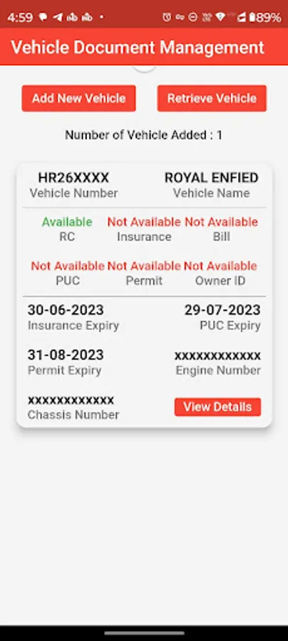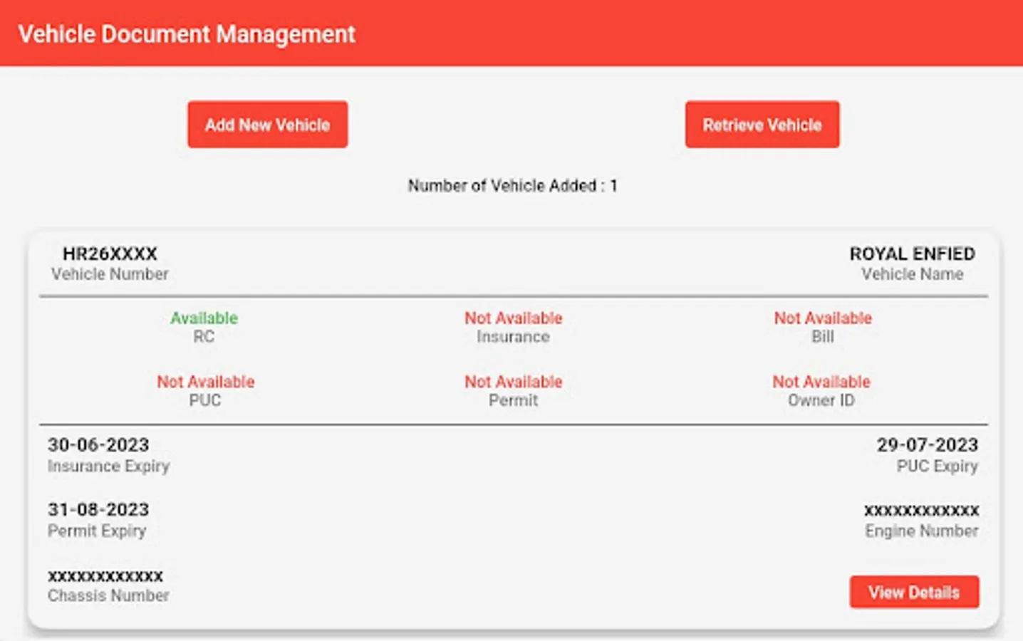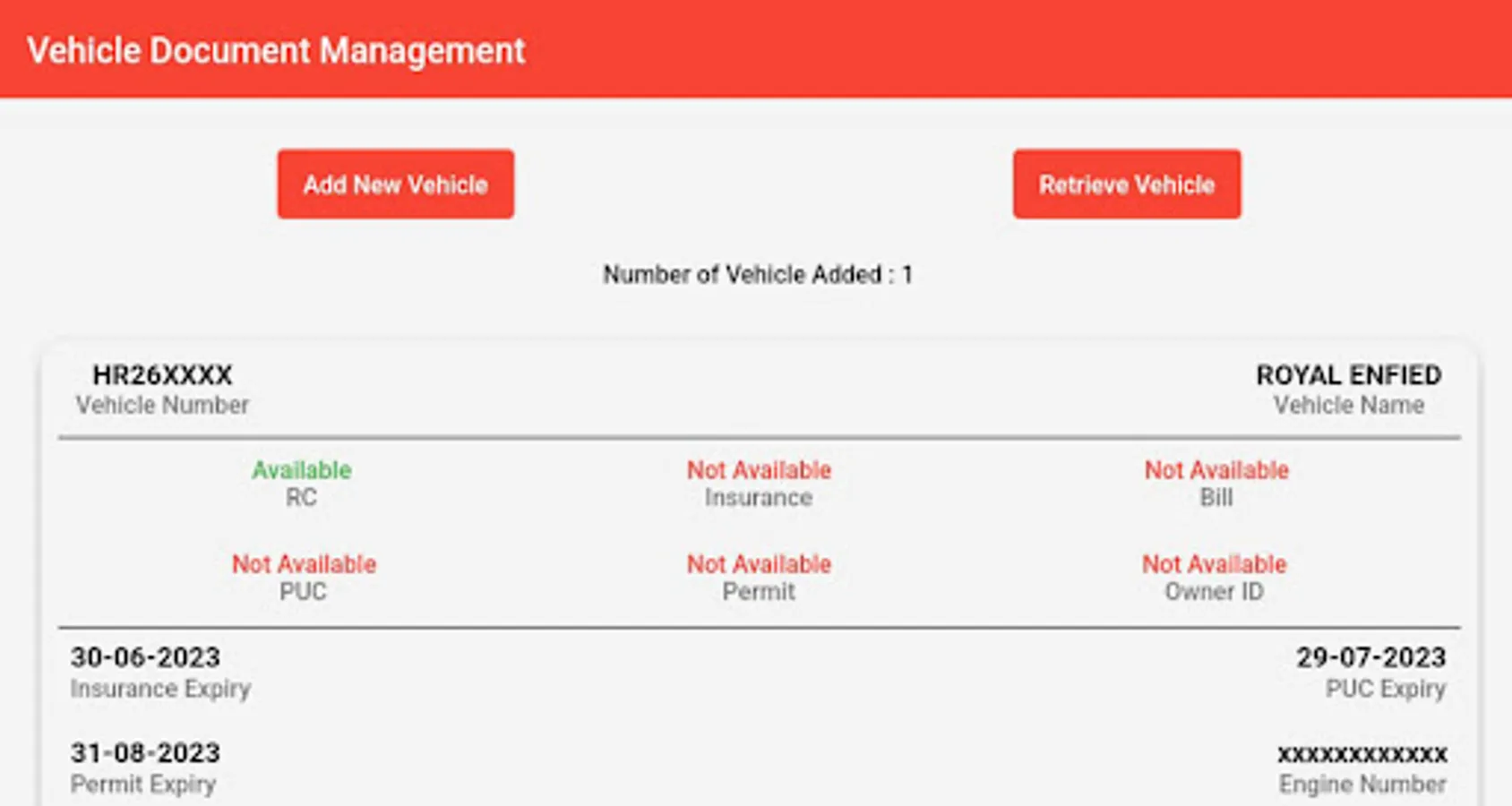 Car/Bike owners can easily manage all their vehicle documents like RC, insurance, Pollution, Purchase bill, Insurance expiry, Pollution expiry, etc for handy management in a single place. These documents can be easily shown to government officers in needed