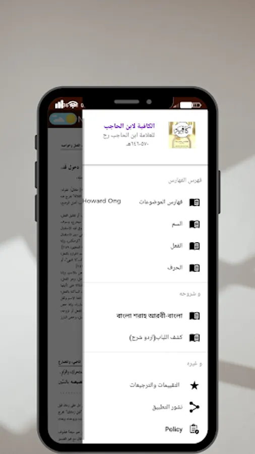 هذا التطبيق يدخل فيه كتاب مهم في علم النحو. اسمه كافية لابن الحاجب و هو مدرج في المنهج الدراسي . يدرس في المدارس القومية في بنجلاديش و باكستان و هند وغيرها من البلاد الشرقية و الغربية . و يعد كتاب الكافية من أهم كتب النحو و الصرف فلذا يكثر شروحه و حواشيه . بعض العلماء شرح له و بعضهم علق عليه إيجازا و إطنابا .