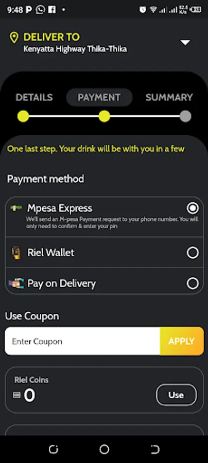 Riel mobile app allows you to browse and shop your favorite from thousands of popular and not so popular drinks and have them delivered to you immediately. We have redefined Convenience in the way you Shop for Alcohol and have it delivered whenever and wherever you are in the Hoods and Cities we serve in Kenya.