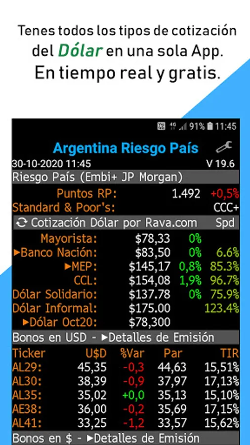 - Quotation of the Dollar Banco Nación, CCL, Stock Exchange, Future Dollar and Euro.