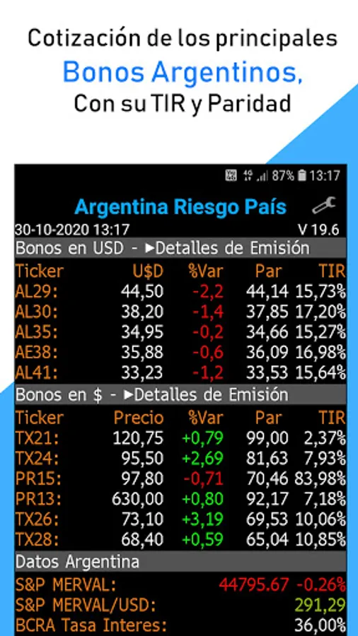 - Quotation, Parity and IRR of the main Argentine Bonds.
