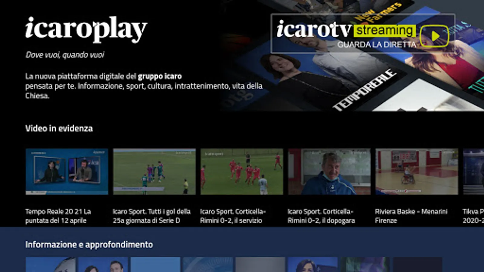 Icaro Play is the digital platform of the Icaro Group designed for you. Local information, sport, culture, entertainment, Church life and live streaming from Icaro TV and Radio Icaro.