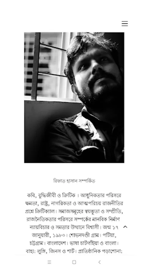 Android Application of Rifat Hasan's Official website, www.rifathasan.com. Rifat Hasan is a young Bangladeshi writer, the author of 'Shomporko, Bondhutto O Rajniti', published in 2014, 'Ei Shomoiti Apni Kibhabe Udjapon Korben', published in 2015 and 'Jolladkhanai Boisha KobitaPath', published in 2020. He was born on 17 January 1980 in a village of Chittagong in Bangladesh. He has institutional studies in Economics and Law and his area of interest are poetry, religion and politics. He has a critical position in understanding power in modern discourse and the states formed by it, citizenship and identity politics. He believes in the autonomy of societies and tolerance among them. Also, he aspires to the revolutionary change of human relations within the political paradigms and the rise of justice and equality.