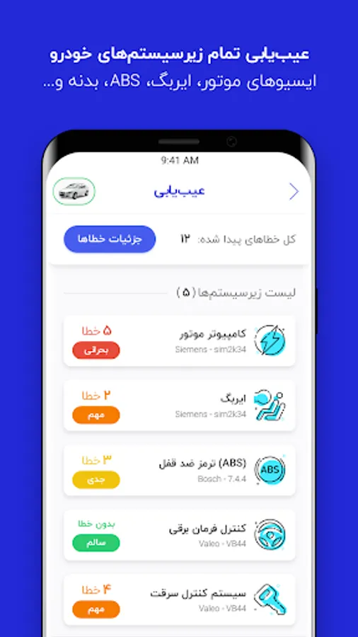 - سرویس عیبیابی تمامی زیر سیستمهای خودرو (ایسیوهای موتور، ایربگ، ABS، بدنه و ...)