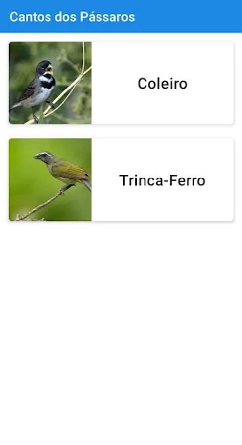 The App has Trinca-Ferro and Coleiro sounds (so far) and also has ambient sound. Allows you to lock the screen and continue singing to save battery power.