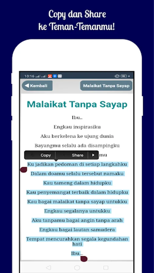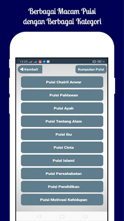 As we know, there are many themes of poetry. Some of them are: love poetry, elementary school children's poetry, English poetry and its meaning, my teacher's poetry, sad poetry, rain poetry, heartache poetry, mother and father poetry, singles poetry, Javanese poetry, independence poetry, poetry of life, funny poetry, Rompis poetry, friend's poetry, Ws Rendra's poetry, romantic poetry, Dilan's poetry, Jalaludin Rumi's poetry, etc. From the many themes above, you can get them in this complete collection of poetry applications.