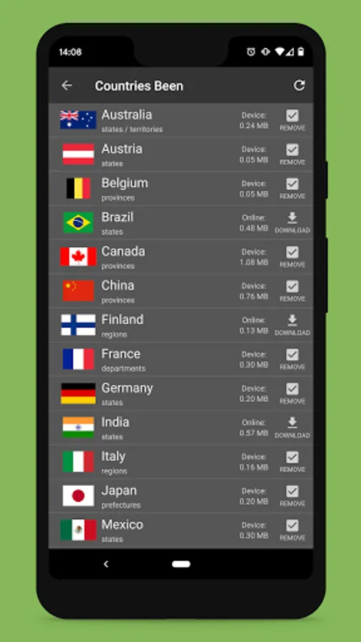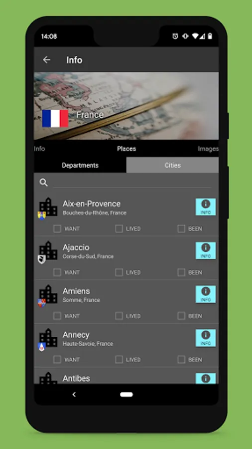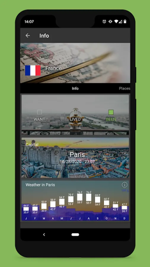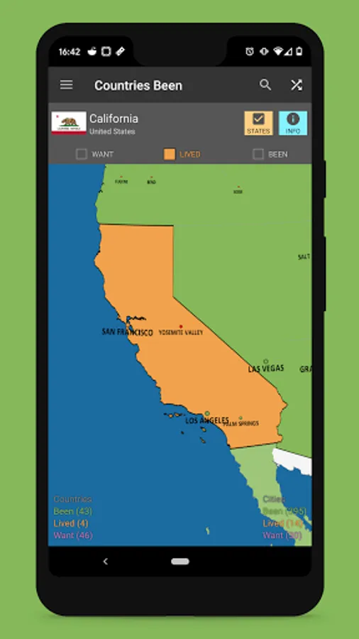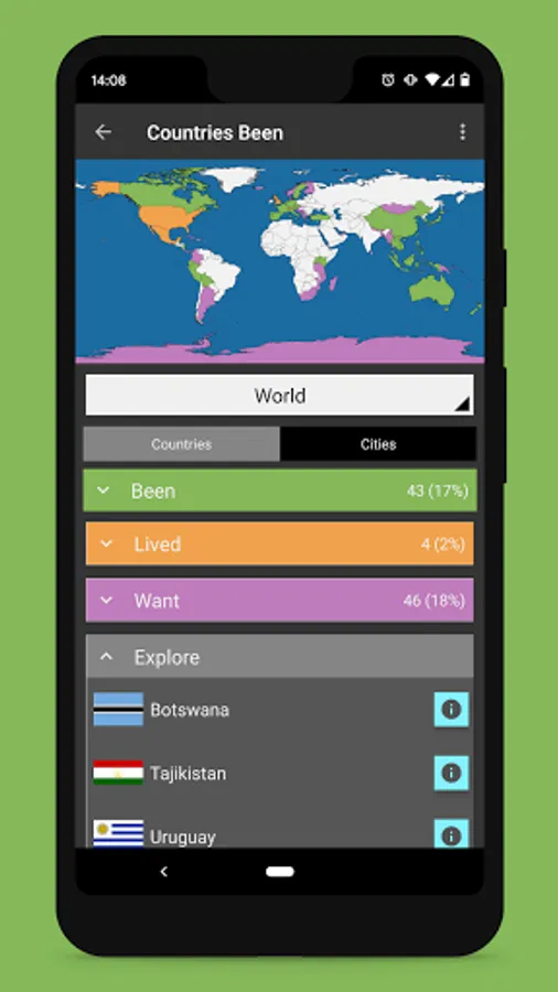 โCountries Beenโ allows you to browse the world, its places, and add the ones you have already explored or want to visit to a colorful visual checklist. You can even use the world map to explore new places and learn more about them, or to see images of popular sites and attractions - useful for gathering ideas for future trips or simply satisfying your travel curiosity. You can share your map onto your favorite social networks, to compare with your friends or use it for bragging rights!