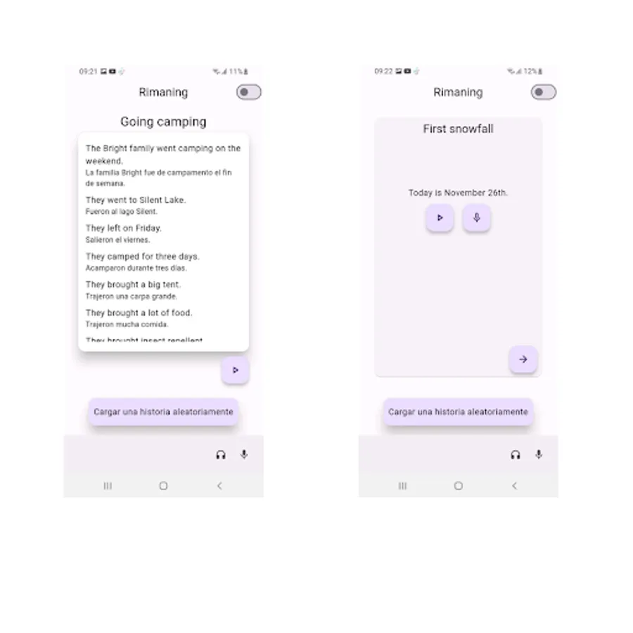 Rimaning is an app that helps you improve your English by listening and speaking. With Rimaning, you can listen to English stories and phrases, practice your pronunciation and get feedback on your progress. Rimaning is a perfect tool for learners of English of all levels, as it offers content adapted to all skill levels.