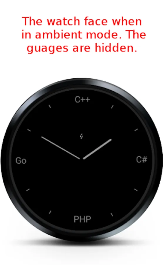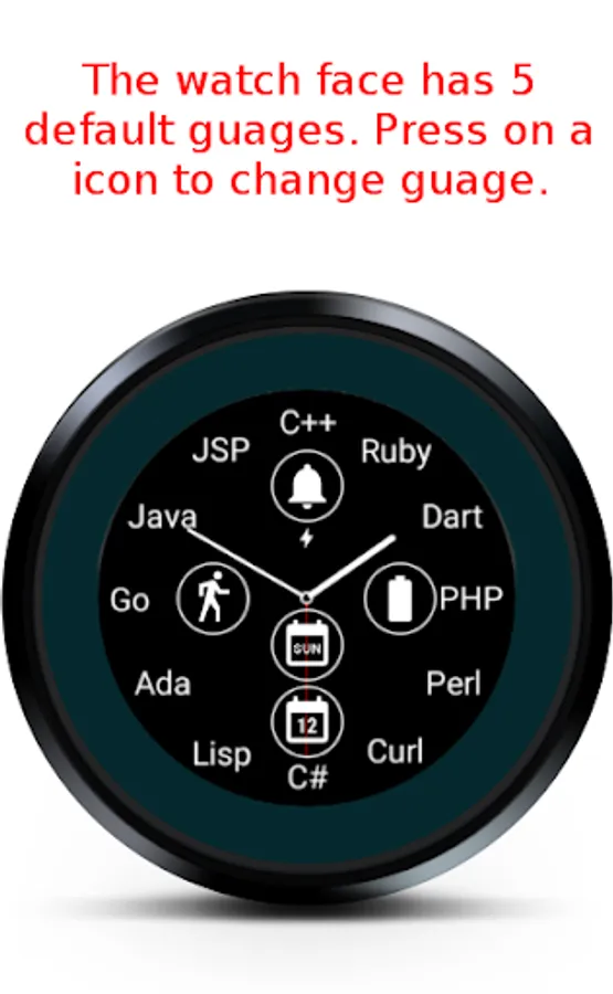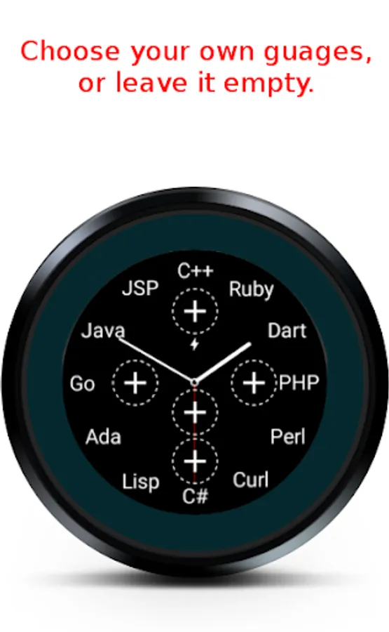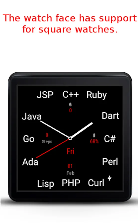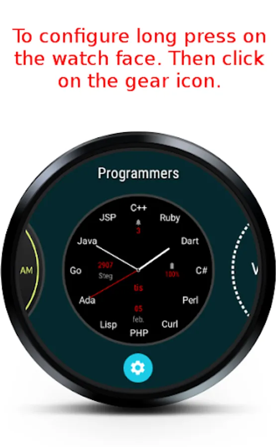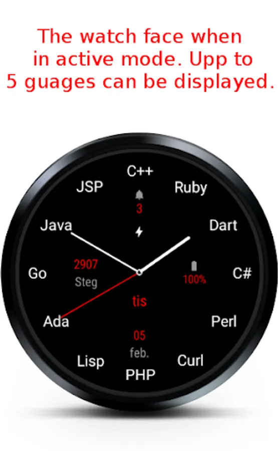 Programmers is a simple yet elegant watch face for us programming geeks who uses an Wear OS device. Rather than showing the numbers 1 to 12, the watch face displays the names of more or less well-known programming languages (C++, Ruby, Dart, C#, Perl, Curl, PHP, Lisp, Ada, Go, Java and JSP).