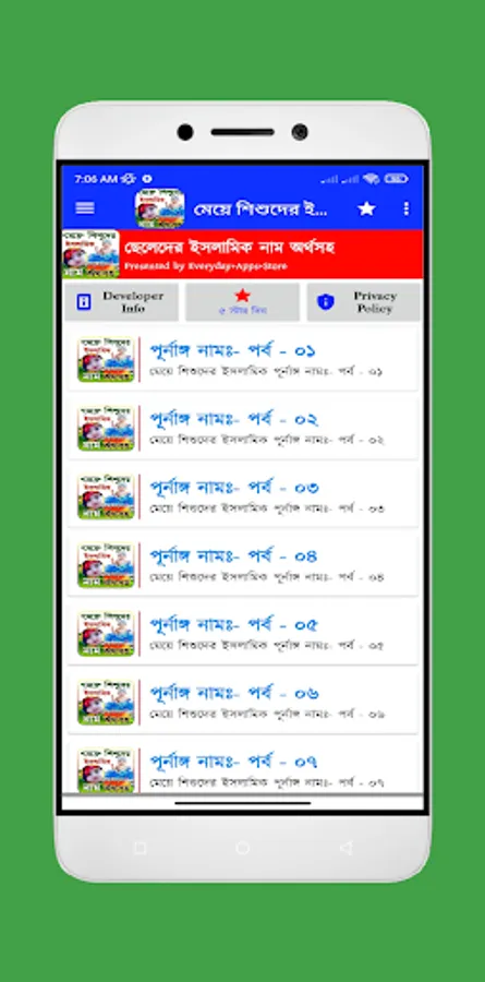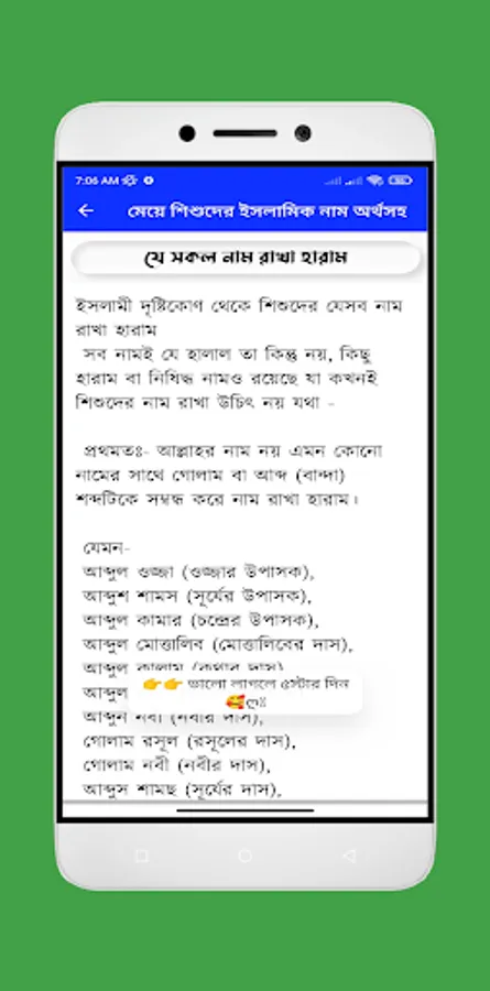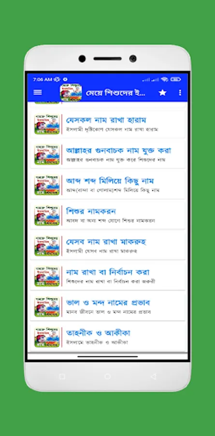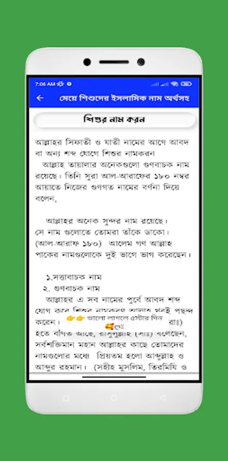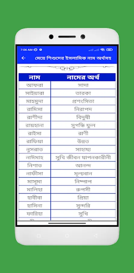 মেয়েদের ইসলামিক সুন্দর নাম অর্থসহ নিয়ে আমাদের এই বারের এই মেয়েদের ইসলামিক নামের বই অ্যাপটি আপনাদের জন্য নিয়ে এসেছই । আপনি যদি আপনার মেয়েদের ইসলামিক নাম খুঁজেন তাহলে আমাদের এই অ্যাপটি আপনার জন্য অনেক কার্যকরী ভূমিকা রাখবে । এখানে পাবেন মেয়েদের ইসলামিক নাম ও অর্থ । ইসলামিক নাম শিশুর জন্য বেহেশত দরজাও খুলে দিতে পারেন। হাদিস , “এক ব্যক্তি নামাজ পড়তনা, গুনাহগার ছিলো, কিন্তু তার নামটা কোন এক নবীর নামে ছিল। প্রতিদিন যখন লোকজন তাকে ওই নামে ডাকত, তার নামে সওয়ার যুক্ত হত। এইভাবে শুধুমাত্র নামের জন্য উনি বেহেস্তে যান। তাই শিশুদের ইসলামিক নাম যেমন সামাজিক দিক থেকে গুরুত্বপুর্ণ তেমনি ধর্মের দিক থেকেও।