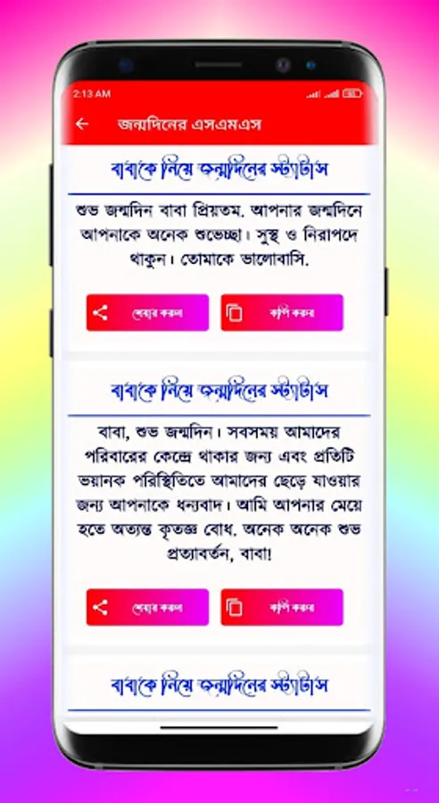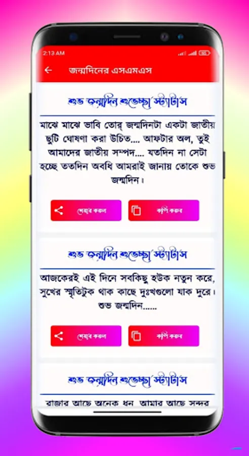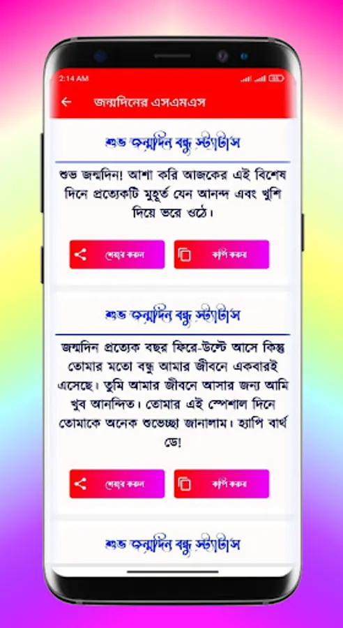 সবগুলো জন্মদিনের শুভেচ্ছা এসএমএস সুন্দর করে সাজিয়ে রাখা হয়েছে । আপনার পছন্দ মতে যেকোন এসএমএস এক ক্লিকেই পাঠিয়ে দিতে পারেন। আমার অ্যাপে প্রতিটি এসএমএস সেয়ার সেন্ড ও কপি করে খুব সহজেই মনের মানুষকে পাঠিয়ে দিতে পারবেন।