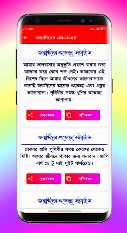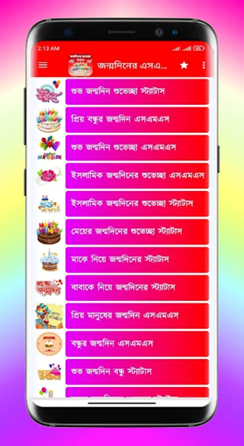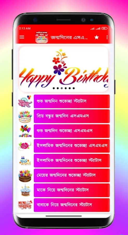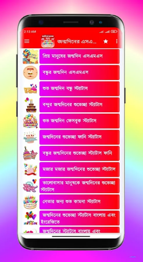 Appটি আবেগঘন বাংলায় জন্মদিনের শুভেচ্ছা এসএমএস ও স্ট্যাটাস এর পাশাপাশি ইংরেজি শব্দ চয়নে Happy Birthday Wishes Status and SMS.