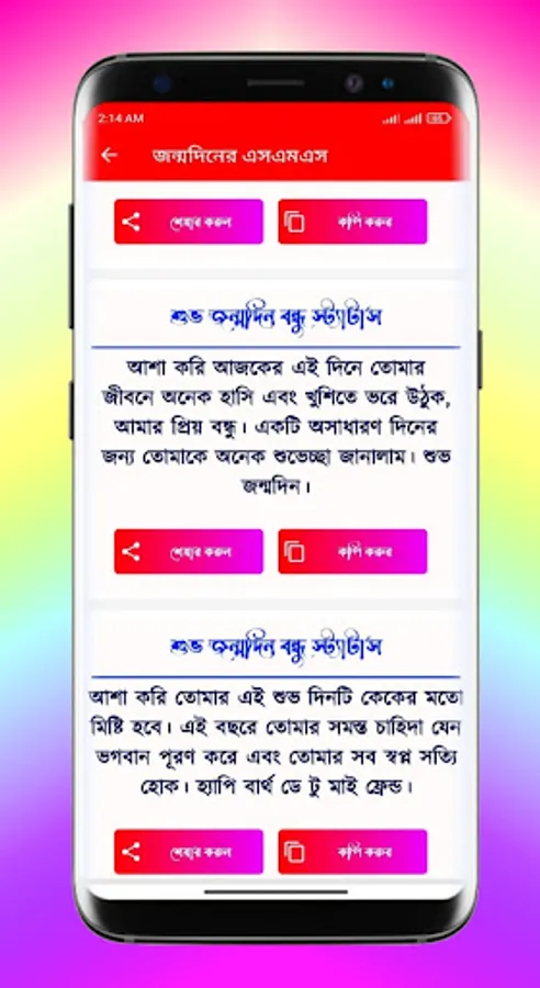 আমাদের এই অ্যাপটিতে নতুন নতুন জন্মদিনের এস এম এস কালেকশন করা আছে। যা আপনার কাছের মানুষকে বা প্রিয় বন্ধুকে ইমপ্রেস করতে খুব সাহায্য করবে। জন্মদিনের শুভেচ্ছা স্ট্যটাস - বন্ধু