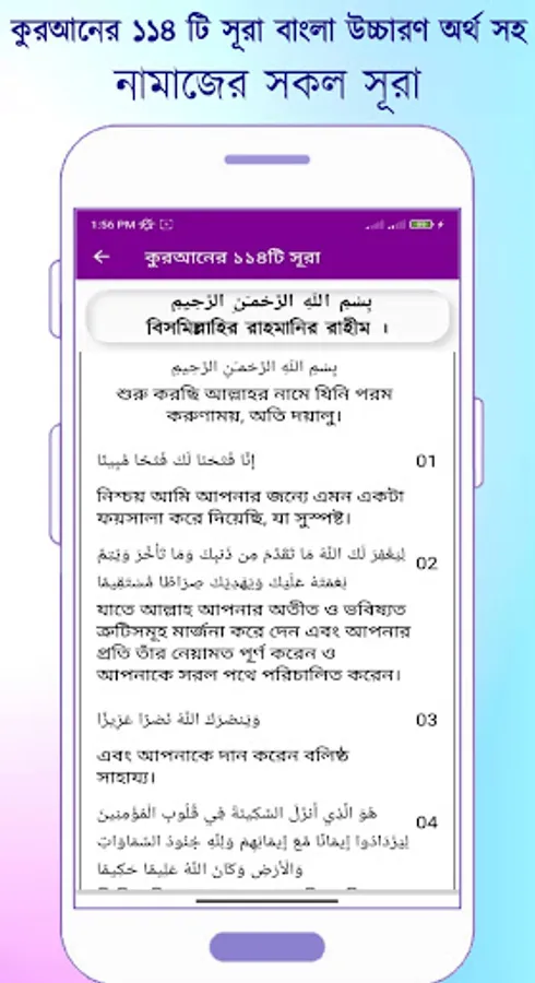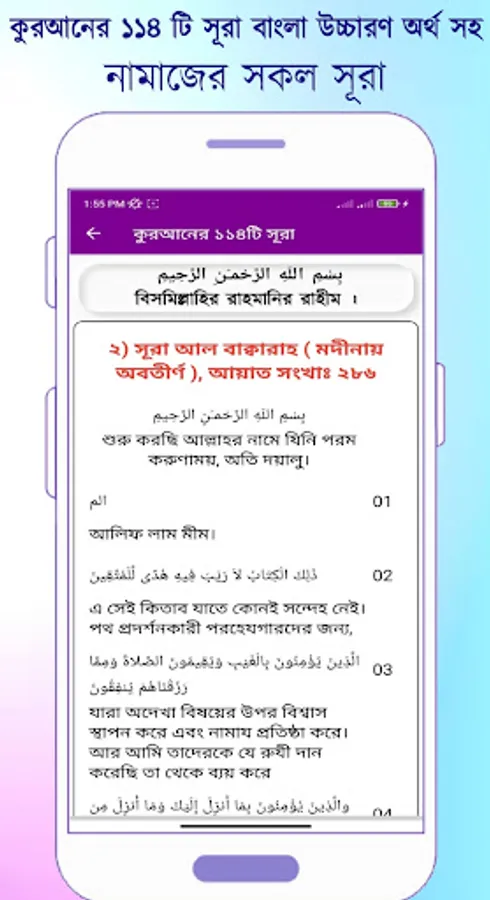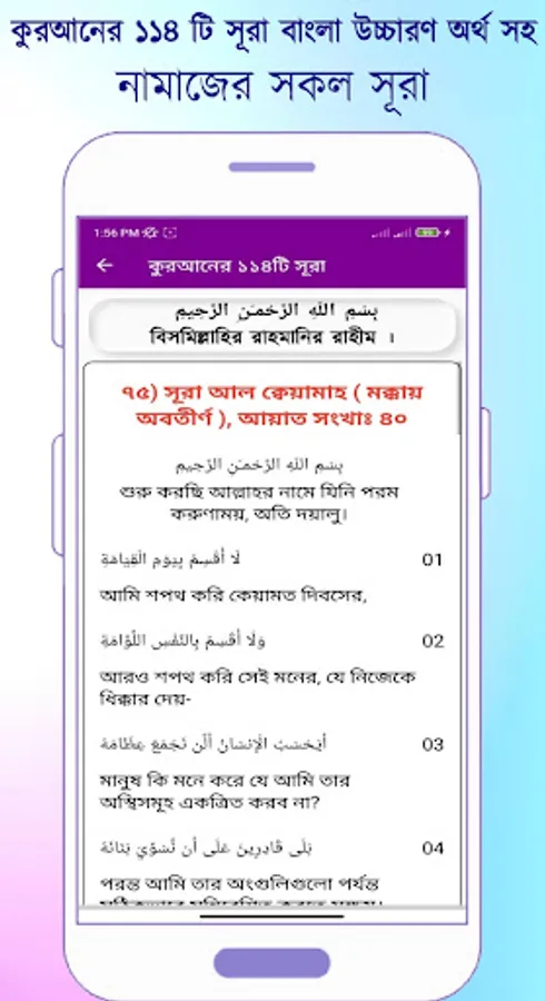 আপনাদের সুবিধার্থে অ্যাপটিতে আরবি, বাংলা উচ্চরন, বাংলা অর্থ, বাংলা অনুবাদ সহ দেওয়া আছে যাতে খুব সহজেই সূরাগুলি শুনতে, পড়তে ও বুঝতে পারা যায়।