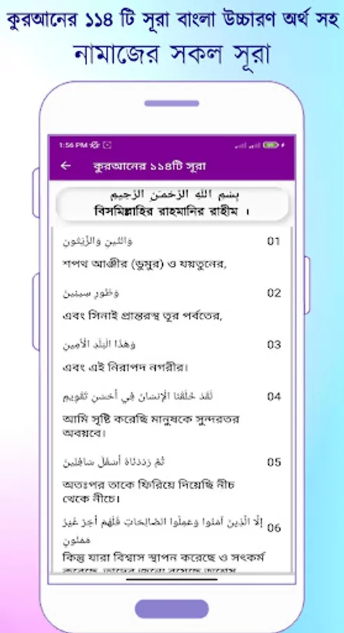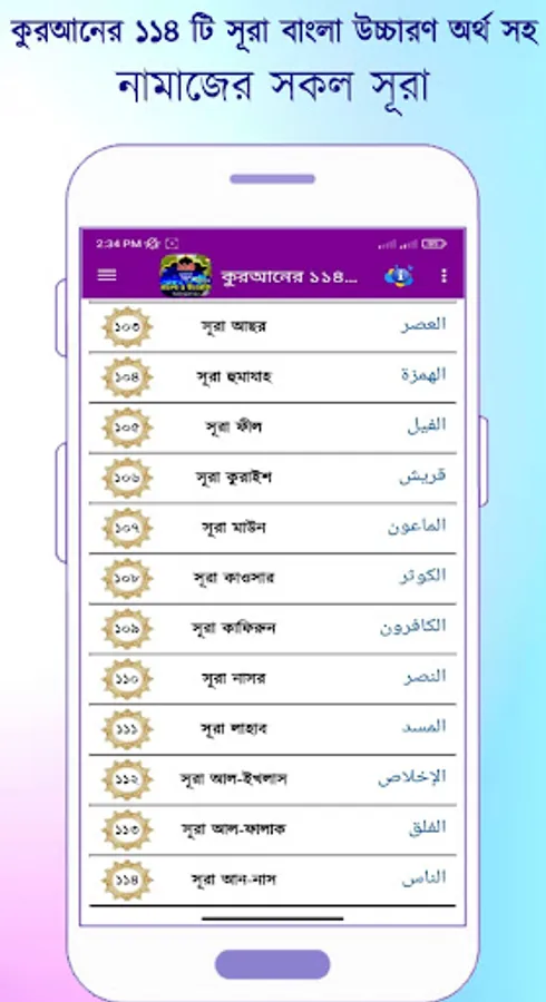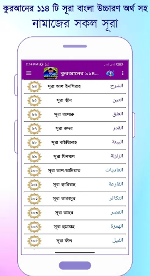 ১১৪ টি সূরা বাংলা উচ্চারণ অর্থ সহ ডাউনলোড করুণ। আল কোরআনের ছোট বড় সকল সূরা বাংলা উচ্চারণ ও অর্থ সহ দেওয়া হয়েছে। এখন থেকে যে কোন সূরা যে কোন সময় মোবাইল থেকে পড়তে ও মুখস্থ করতে পারবেন।
