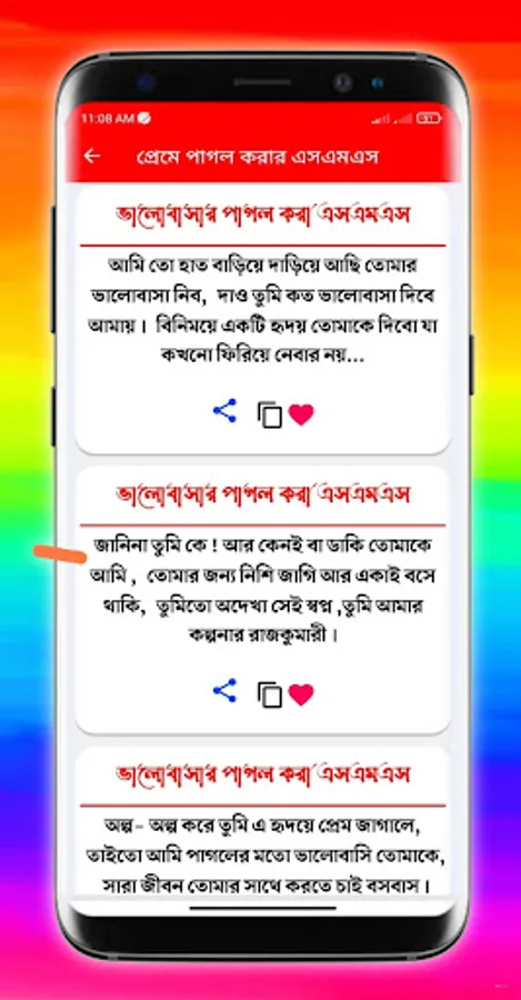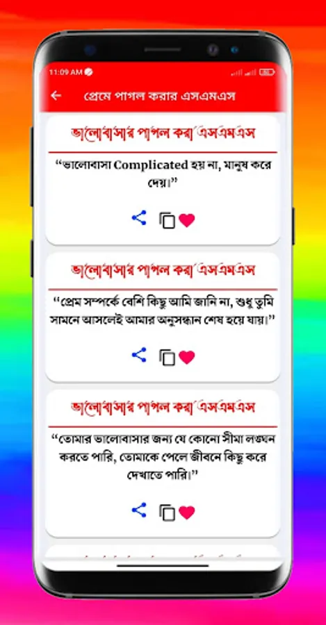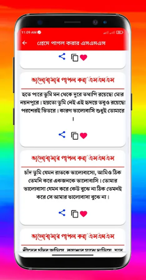 প্রেমে পাগল করার এসএমএস অ্যাপটি ভিতরে যে এসএমএস আপনার পছন্দ হবে সেটা আপনি আপনার প্রিয়জনের সাথে Share করতে পারবেন। Share করার জন্য প্রতিটা এসএমএস এর নিচে Copy এবং Share এর বোতাম দেয়া আছে, সেই বোতামটি টিপে আপনি সেই এসএমএস টি Share করতে পারেন।