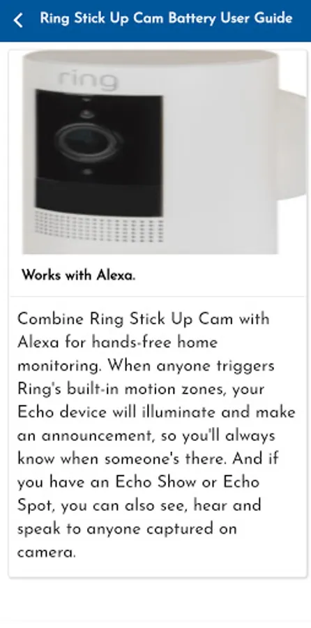 1. See, hear and speak to people from your phone, tablet or select Echo device with Stick Up Cam Battery, a battery-powered camera that can be mounted indoor or out.
