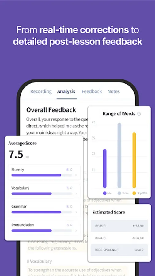 The app provides lesson notes and feedback for review, so you can review it over and over again to correct mistakes.