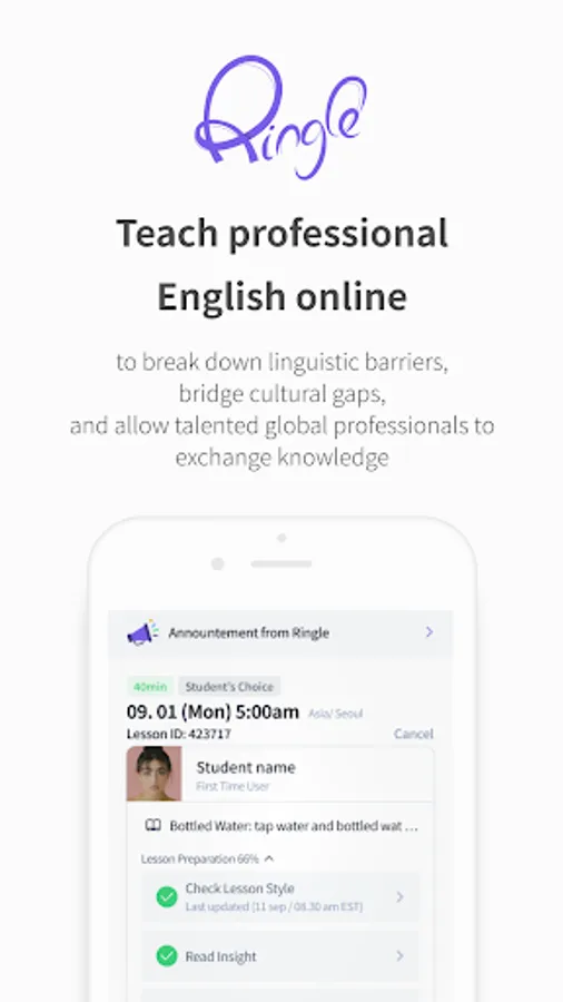 In our current app, Ringle tutors can schedule for a lesson, be reminded for upcoming lessons, view past lesson summary, receive push notifications about unassigned lessons, and review compensation history.