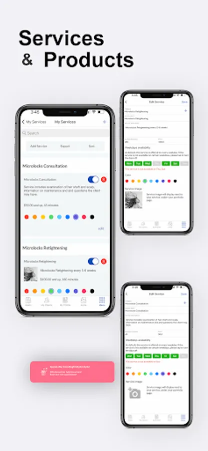 5. Service Management: Present your services with pictures and descriptions, and set availability by day.