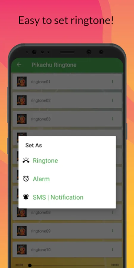 First, you can download this free Pikachuu Ringtone app, Then you can press the " play " button to listen to the ringtone, and to set it as ringtone click on three-dot(⋮) and choose the ringtone you are done!