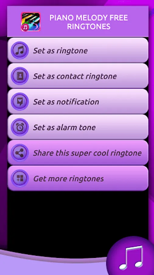 Make your day! Download Piano Melody Free Ringtones and enjoy the classics! Embellish your soundboard with the “most popular ringtones”! This free “piano app” will give your phone a sophisticated touch! Choose a ringtone that is new and popular and make sure that it is not boring, old-fashioned or irritating. You don't need to buy mobile tones online anymore! We offer you a classical collection of piano music “ringtones for free”! If you are bored with the ringtones you have on your Android phone, the solution for your problem is this great free ringtone with piano sounds! Assign cool ringtones to your friends and family and share these “awesome ringtones” with them!