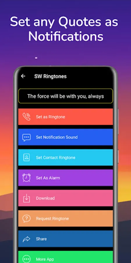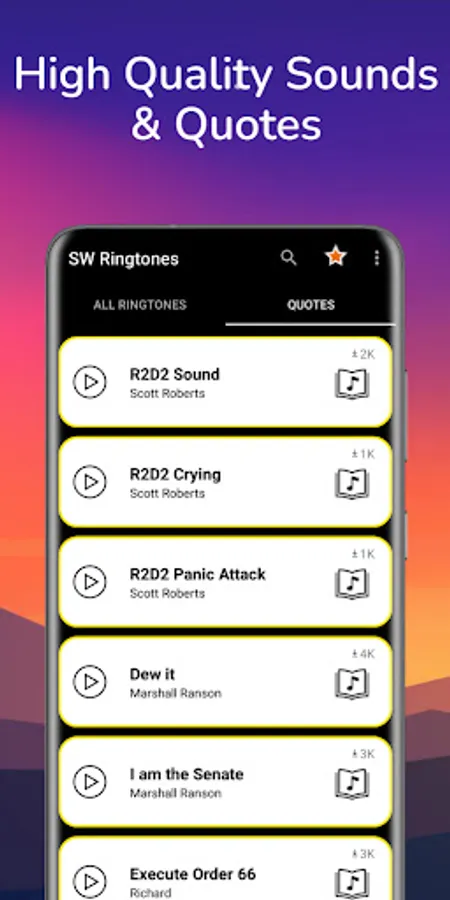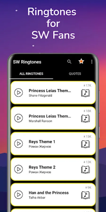 This app contain the original ringtones of SW and Quotes. Download SW Ringtones now and get original SW Ringtones and Quotes on your Android smartphones!